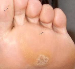 Wratjes: Deze worden door een virus veroorzaakt en zijn dus besmettelijk. De kans op besmetting is het grootst in onder andere zwembaden en sportzalen of door het passen van schoenen met blote voeten. Een wrat is een goedaardige woekering van het epitheel van de huid. Doordat er bloedvaatjes in meegroeien, kan een wrat makkelijk bloeden. Als de wratten zich onder de voet bevinden kunnen ze erg pijnlijk zijn. Voetzoolwratten zijn vaak met een laagje eelt bedekt en lijken daardoor vaak op een likdoorn. Eén van de verschillen tussen een likdoorn en voetzoolwrat is dat de wrat vaak pijn geeft bij zijwaartse druk (knijpen) en de likdoorn geeft pijn bij druk van boven.